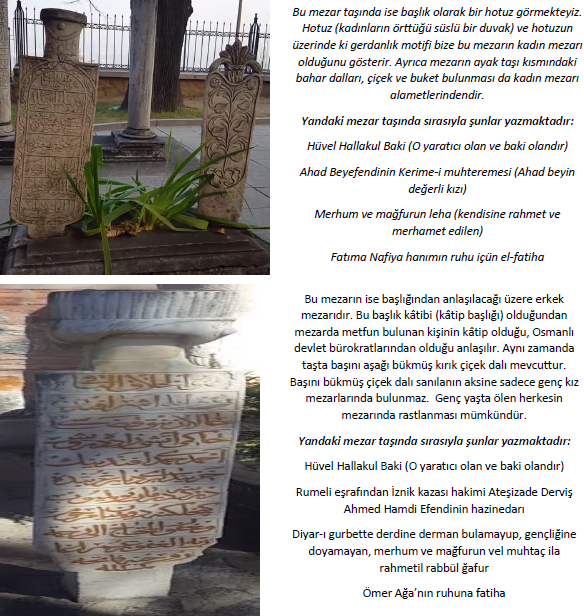 Osmanlı mezar taşlarına baktığımızda Osmanlı Türkçesi bilmiyor olsak bile o mezar hakkında az çok fikir sahibi oluruz. Mezarın başlığı ve üzerindeki semboller bizi medfun kişi hakkında fikir verir.