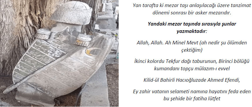 Tanzimat dönemi ve sonrasında ise mezar taşlarında özellikle başlık olarak fes kullanılmıştır. Tanzimat dönemi ve sonrası asker mezarlarında daha çok armalar dikkate değerdir. Özellikle top ve tüfek sembolü, flamalar ve bahriyeli askerlerin mezarlarındaki çapa sembolü asker mezarı alametlerindendir.