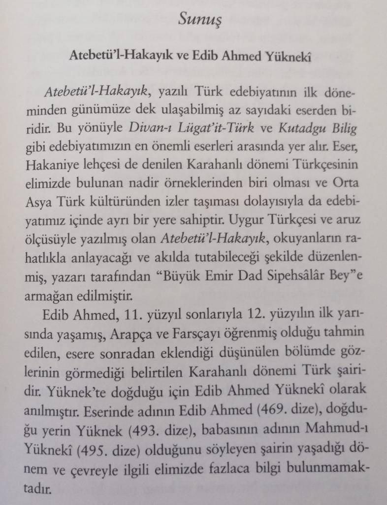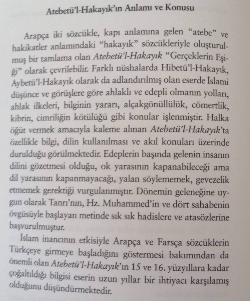 Bu sayfalar İş Bankası Kültür Yayınları, Atabet’ül Hakayık isimli kitabın giriş kısmından alınmıştır.