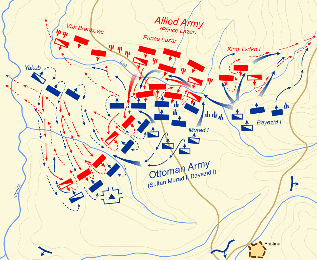Kaynaklarda Kosova Meydan Muharebesi’nin nasıl cereyan ettiği ve olayların hangi sırada gerçekleştiği konusunda çok fazla çelişki vardır. Ancak şu sabittir ki genel hatlarıyla Osmanlılar savunmada kalmış ve Koalisyon birlikleri saldıran tarafta olmuştur. Zaten ağır zırhlı atlı askerlerden müteşekkil bir ordu için aksi bir durum harp sırasında taktik ve stratejik bakımdan aleyhe bir durum teşkil edebilirdi. Lazar’ın muharebe esnasındaki planı, ağır zırhlı süvarilerin topyekün hücumu ile Osmanlı ordusunu sert bir taaruzla ve tek seferde bozguna uğratmak üzerine kurulmuştur. Sırp Prensinin izlediği bu strateji o zamana kadar birçok İslam ordusuna karşı bu tarz koalisyon birliklerinin muzafferiyetini sağlamıştır.