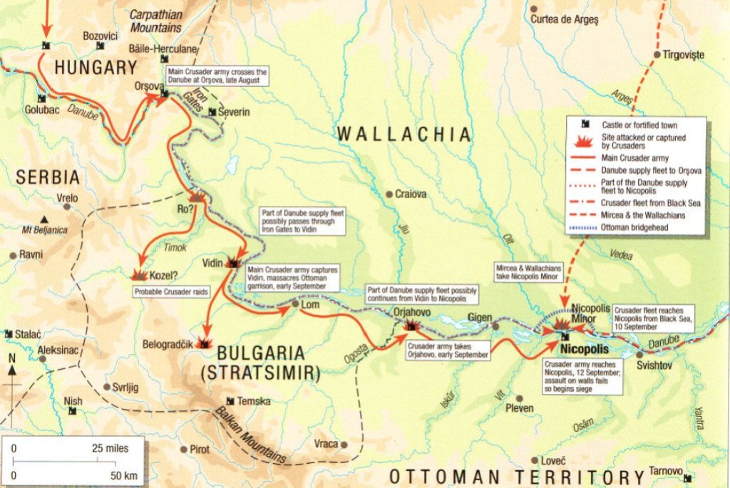 Haçlı ordusu harekata Temmuz ayının sonunda başlamış ve birkaç farklı koldan Tuna’yı geçmişlerdir. Karşılaştıkları ilk ciddi hedef Vidin kenti idi. Ancak kaleyi savunan ve Osmanlı haraçgüzarlarından olan Bulgar Prensi Strashimir şehri haçlılara teslim etmiş ve şehirdeki Osmanlı garnizonu da katledilmiştir. Fransızlarca kuşatılan Rahova kalesi bir süre dirense de Eylül ayının başında haçlıların eline düşmüştür. Haçlı ordusu çeşitli kale ve şehirleri ele geçiriş ve Müslüman ya da Hristiyan ayrımı yapmaksızın korkunç bir katliama girişmiştir.