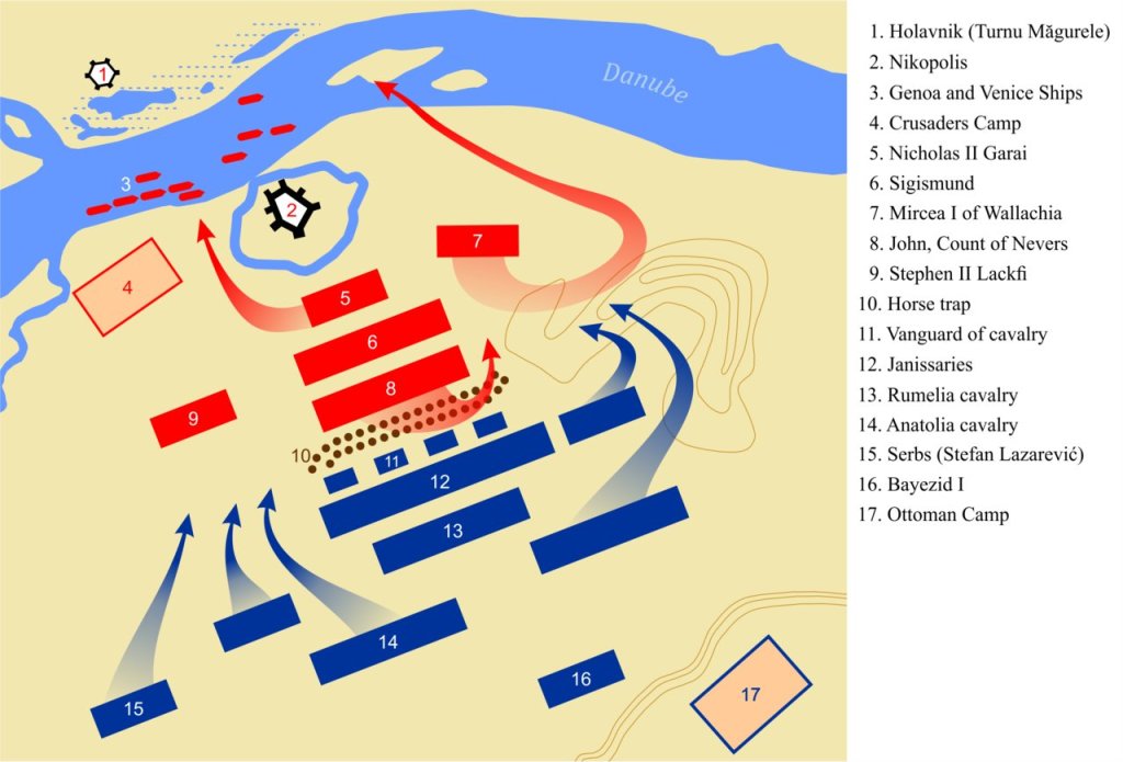 1396 baharında Fransaya bağlı Burgonya Dükünün oğlu olan Jean de Nevers komutasında Fransızlar yürüyüşe geçti. Ayrıca Fransız ordusunda Bar dükünün oğlu Phillippe, Guy de la Tramouille, kardeşi Guillaume, Amiral Jean de Vienne, Chasseron hakimi Oudard gibi asilzadeler de bulunuyordu. Bütün Haçlı ordusunun Macaristan’ın başkenti Buda’da (Budin) toplanması kararlaştırılırdı.