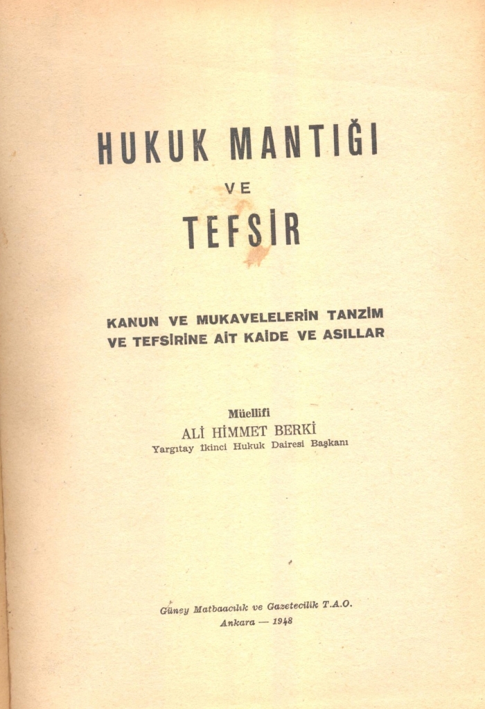Bu başlık altında Ali Himmet Berki’nin Hukuk Mantığı ve Tefsir adlı eseri hakkında hülasaten malumat verilecektir. Hem Osmanlı hem de Cumhuriyet dönemi hukukçularından olan Ali Himmet Berki’ye göre, kanun ve mukavelelerin yorum ve yazımında bizi ihtilaf ve hataya düşmekten alıkoyacak kaide ve yorum yöntemleri daha işin başında İslâm hukukçuları tarafından düzenlenmiş ve bu ilme “Usûl-i fıkıh” adı verilmiştir. Bu ilim ise cumhuriyetin ilk yıllarına kadar hukuk fakültelerinde okutulmakta iken, hukuk inkılâbından sonra ders programından çıkartılmış, fakat bunun yerini dolduracak bir kürsü ihdas edilememiştir. Bununla beraber ilm-i hukukun giriş kısmında tefsir ve içtihattan bahsedilirse de bu, usûl-i fıkha küçük bir temastan ibaret olup yetersiz kalmıştır. Halbuki usûl-i fıkıh ilmi, başlı başına üzerinde durmaya ve fikir yormaya değer bir ilim olup, her ilmin kendine özel kaide ve incelikleri bulunduğu gibi bu ilmin de özel kaide ve incelikleri vardır.[21]